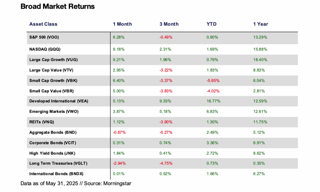 Markets continued to rally in May, largely rebounding from the early-April tariff woes.